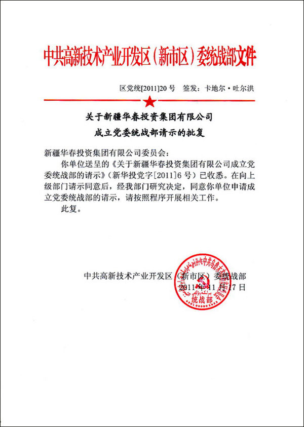 11月17日下午,新疆華春投資集團(tuán)黨委書記嚴(yán)天利,懷著激動的心情從高新區(qū)(新市區(qū))委統(tǒng)戰(zhàn)部接過批復(fù),同意華春集團(tuán)成立黨委統(tǒng)戰(zhàn)部,請按照秩序開展相關(guān)工作,至此,標(biāo)志著非公有制企業(yè)統(tǒng)戰(zhàn)工作全面開始。
