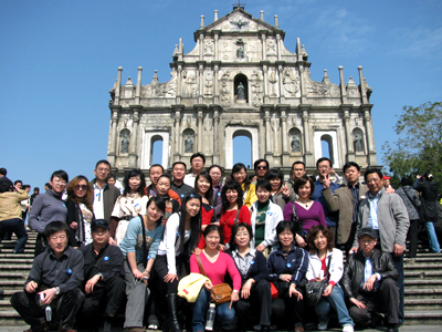 由香港借渡輪前往澳門,“賀國慶、慶回歸”的巨標,提醒著人們這里剛剛舉行過澳門回歸10周年的慶典。穿越了五百年的歷史,今天擺脫了殖民地的澳門,除了葡萄牙駐澳門總領事官邸掛著的一面綠色葡萄牙國旗外,其它皆是中華人民共和國國旗和澳門區旗,顯示著回歸的澳門,其背后有著強大祖國的支持。