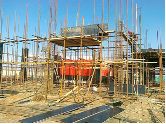 食堂為框架結構二層,一層柱、梁、板施工完畢,二層框架柱鋼筋已綁扎完畢。