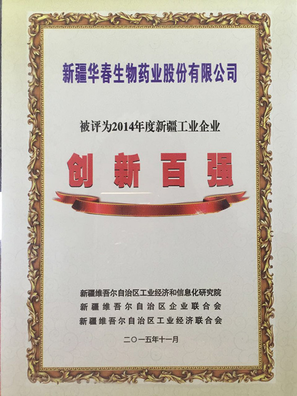 同時在新疆華春藥業全體同仁近一年的努力下,終于在這8家醫藥企業中占有一席,榮獲新疆工業企業“創新百強”稱號。進一步增加了華春藥業的品牌價值,為藥業的宣傳與發展又增添了濃墨的一筆。