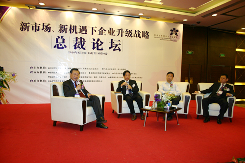 圖為:香港理工大學院長高級顧問曾慶忠在論壇上主持由新疆華春投資集團有限公司董事局主席兼總裁李成功、西子聯合控股有限公司董事長王水福、賽維LDK太陽能有限公司董事長兼總裁彭小峰參加的《強強合作企業騰飛戰略》專題討論。