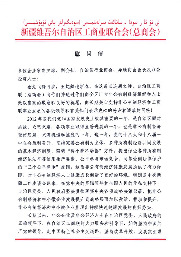 2013年1月17日,自治區(qū)工商聯(lián)黨組成員、自治區(qū)工商聯(lián)副主席努爾力•尤努斯和自治區(qū)工商聯(lián)光彩辦副主任陳風(fēng)玫一行2人,春節(jié)前代表自治區(qū)工商聯(lián)主席及黨組來(lái)華春投資集團(tuán)慰問(wèn)企業(yè)家副會(huì)長(zhǎng)李成功總裁并送上自治區(qū)工商聯(lián)黨組的慰問(wèn)信和鮮花。
