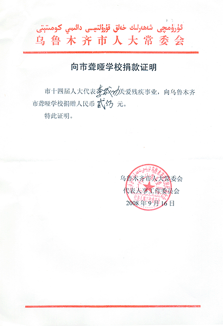 新疆華春投資集團(tuán)董事局主席兼總裁、市人大代表李成功先生,于9月16日上午派代表在烏魯木齊市人大給烏魯木齊市聾啞學(xué)校捐款2萬元。